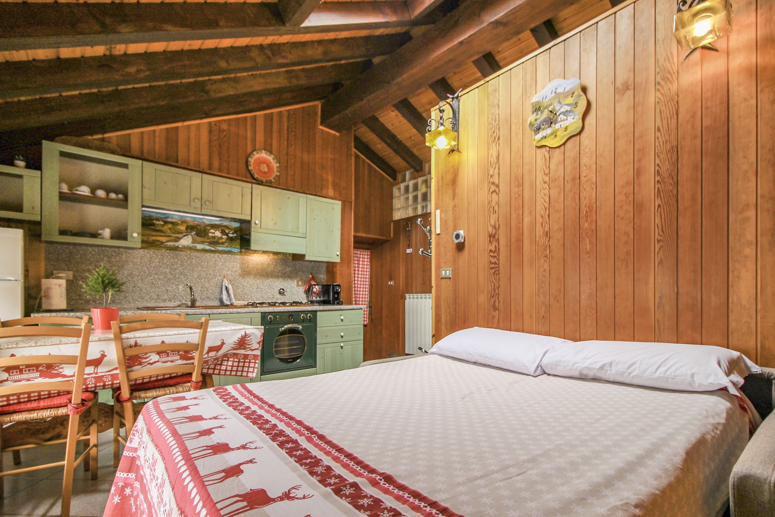L'alloggio è composto da un soggiorno con cucina e divano letto per due persone con materasso da 18 cm, una camera matrimoniale e un bagno con doccia.