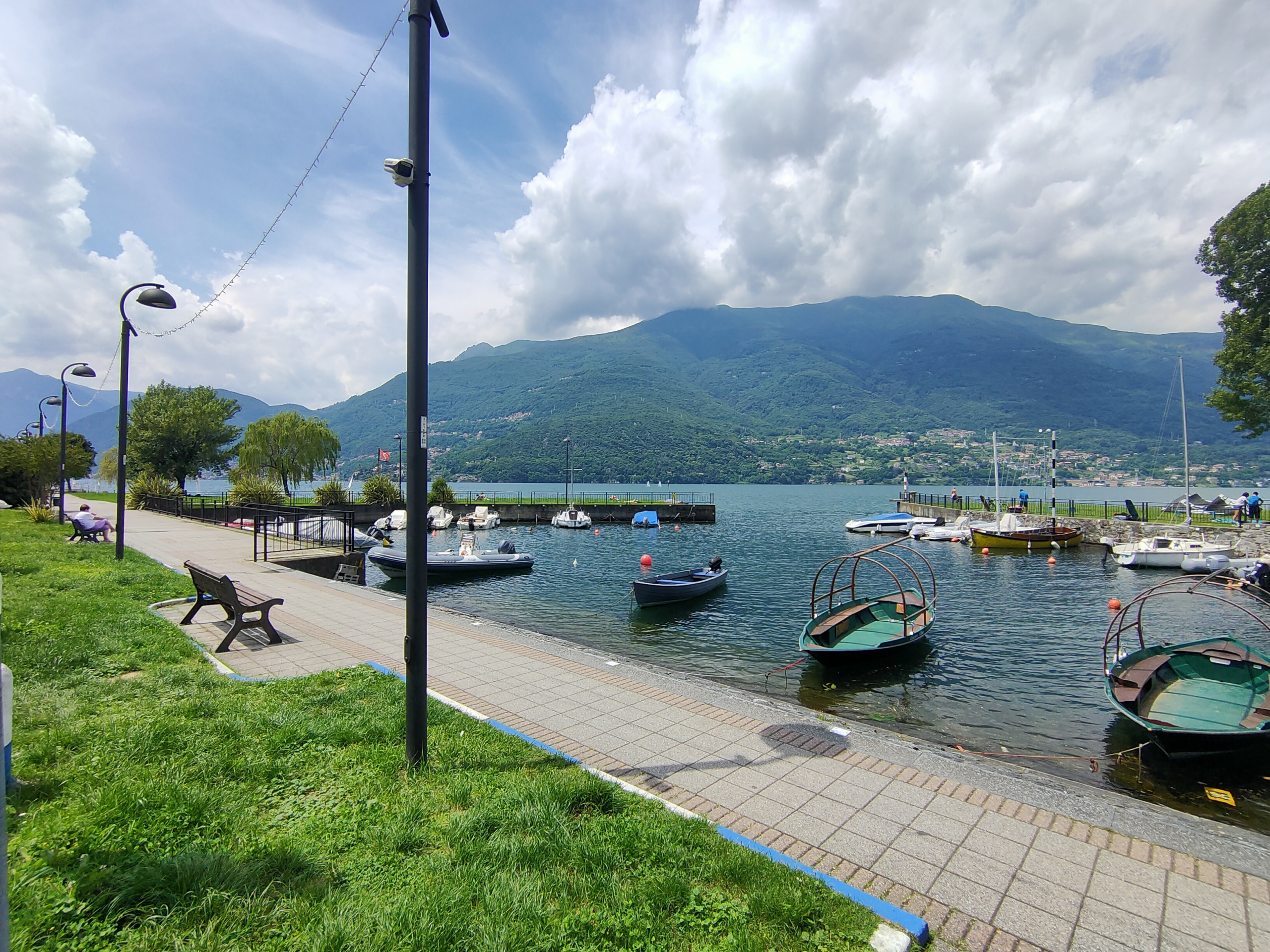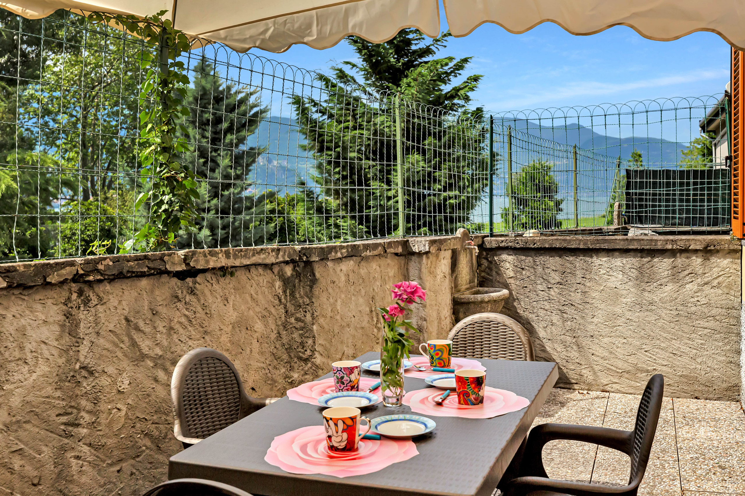 E' composto da un soggiorno con divano letto ed una cucina a vista totalmente attrezzata e con lavastoviglie, zona pranzo con tavolo per quattro persone. La camera da letto è matrimoniale e luminosa, con armadio ed affaccia sul retro del giardino privato, con vista laterale sul lago.