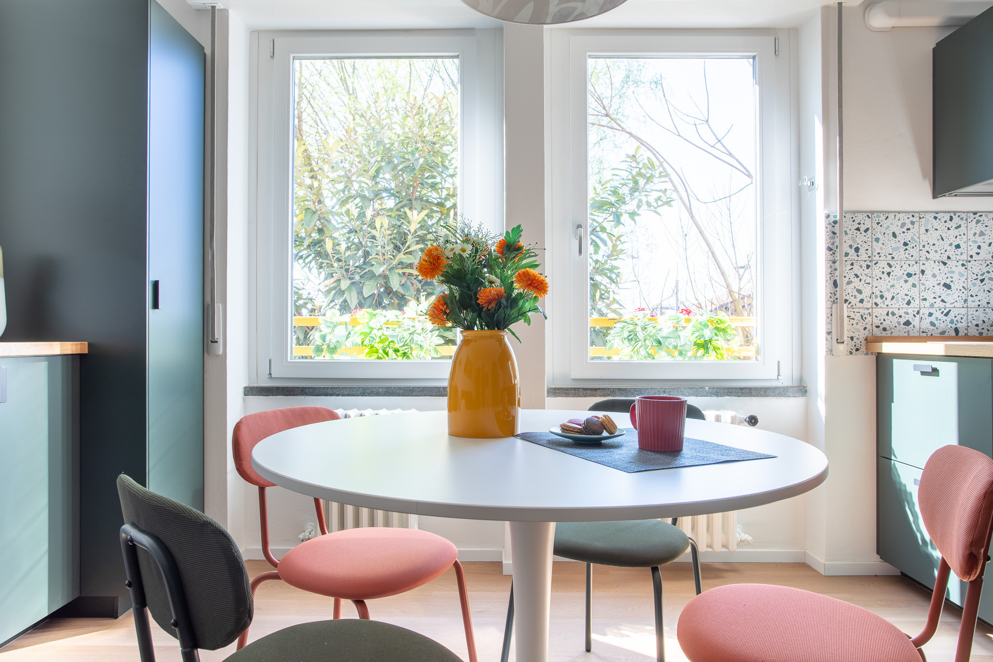 -La zona pranzo, avvolta dalla luce naturale grazie all’ampia vetrata sul cortile interno, è il posto ideale