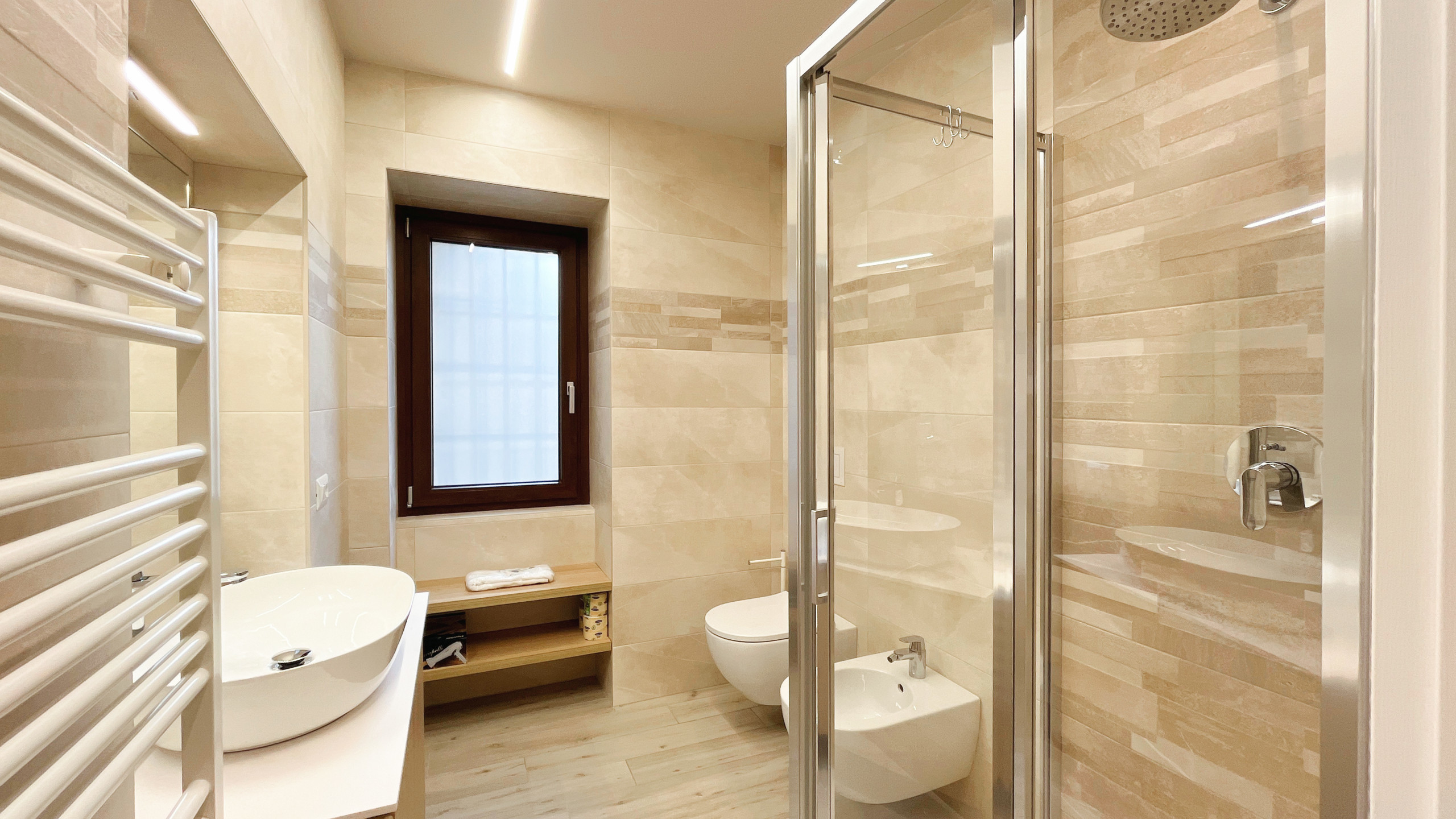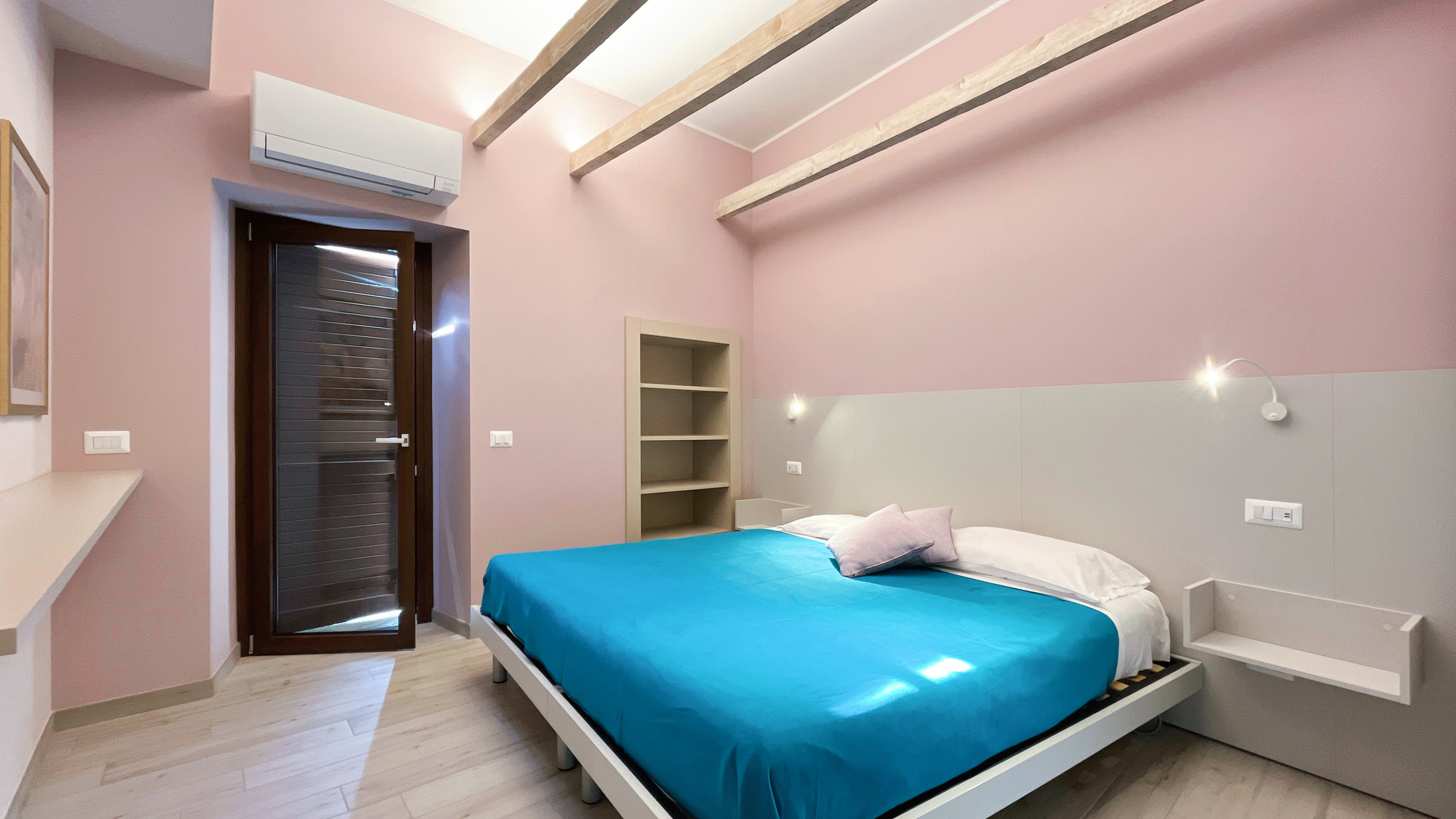 L'appartamento dispone anche di una camera matrimoniale, confortevole e ben arredata, con accesso a un piccolo balconcino privato, ideale per godersi l'aria fresca. Il bagno, moderno e pratico, è dotato di una comoda doccia.