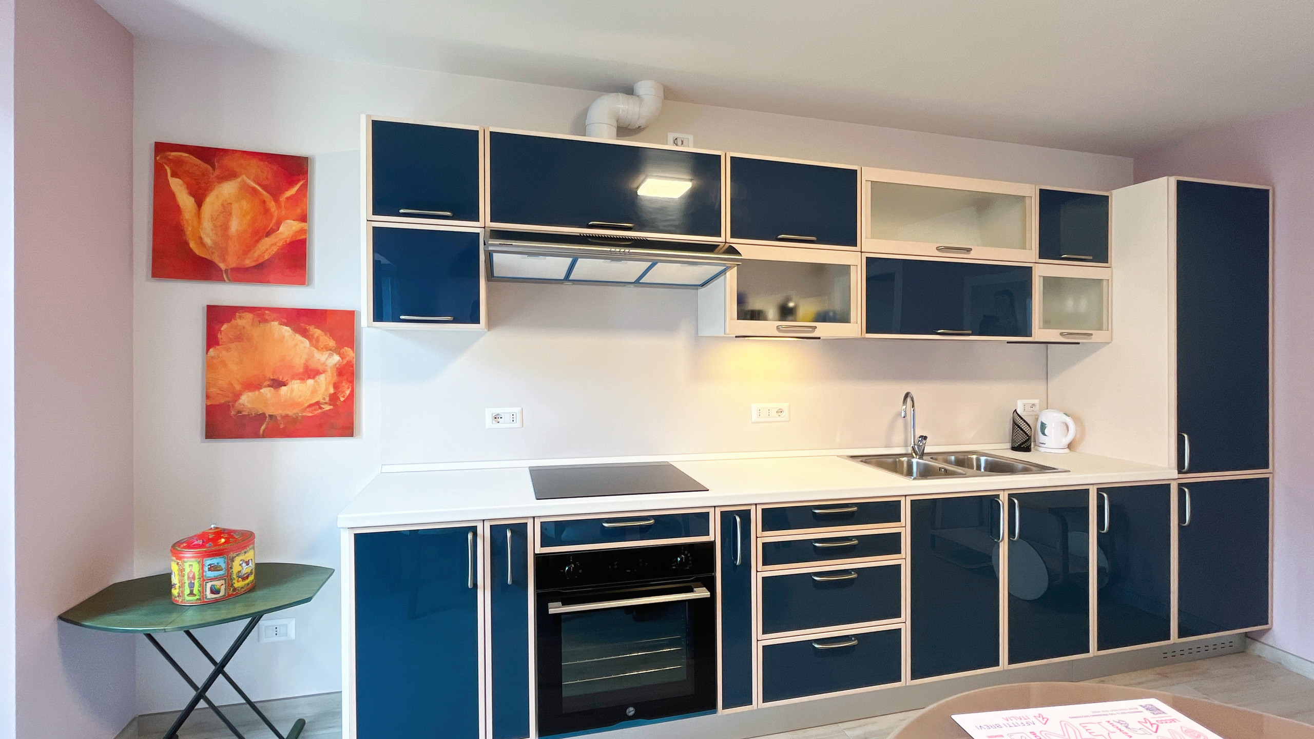 Appena entrati, vi accoglie un luminoso soggiorno arredato con un comodo divano letto, perfetto per ospiti extra o semplicemente per rilassarsi. Le finestre del soggiorno offrono una vista panoramica sul lago, che rende l'ambiente ancora più speciale. La cucina, moderna e funzionale, è caratterizzata da un affascinante colore blu e completamente attrezzata, offrendo tutto il necessario per preparare i vostri pasti.