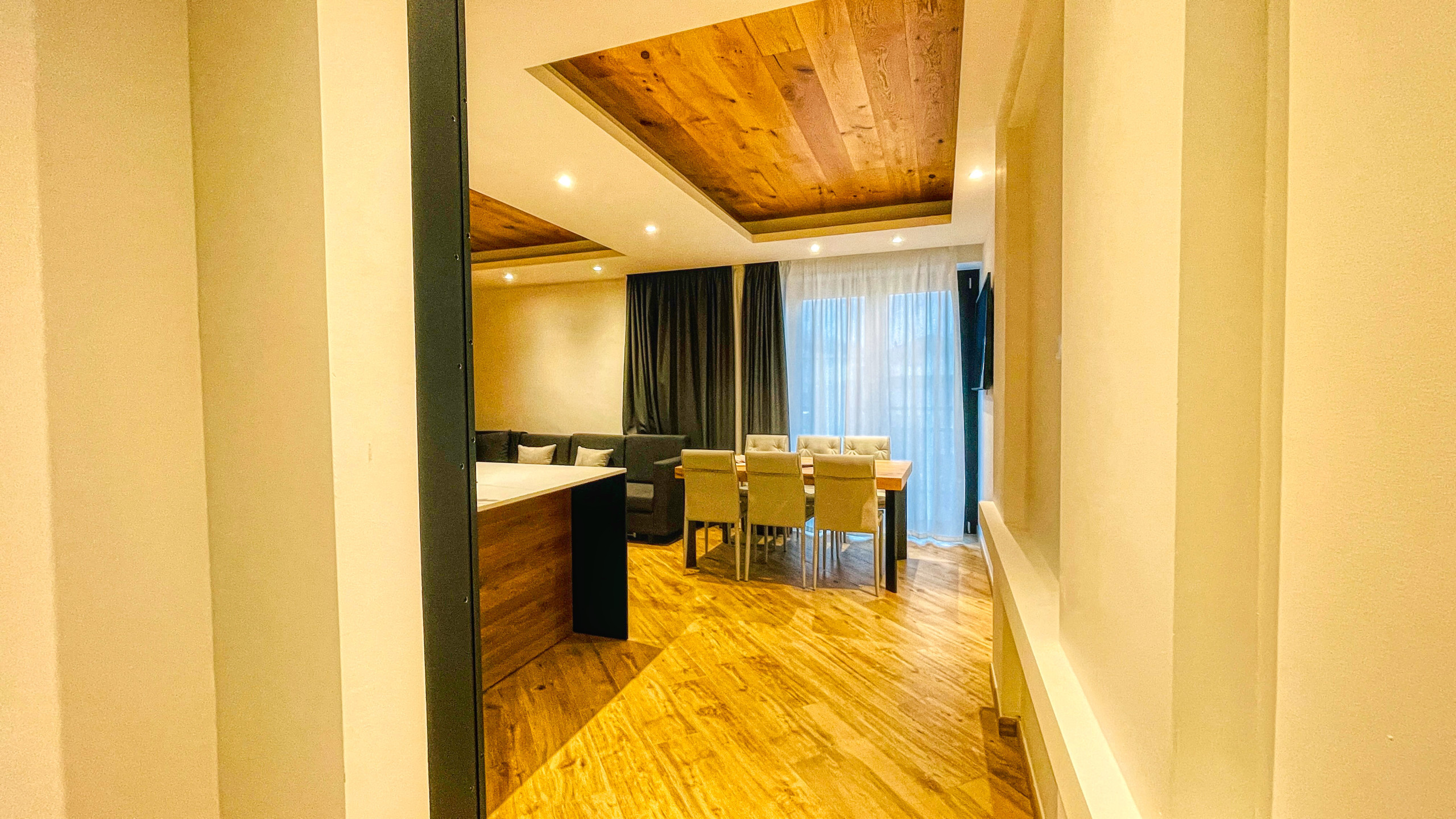 Al piano primo rialzato, l'abitazione è composta dall'ingresso, soggiorno fornito di ampia cucina con penisola, zona pranzo e divano letto. A disposizione degli ospiti la Smart Tv (con possibilità di collegamento alle piattaforme streaming mediante account personali degli ospiti).