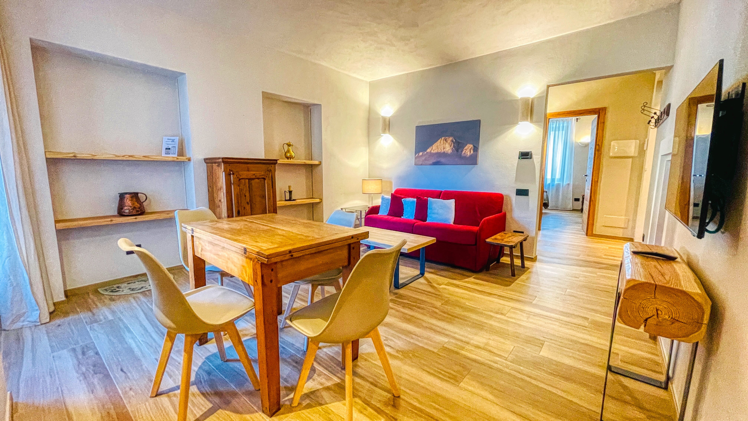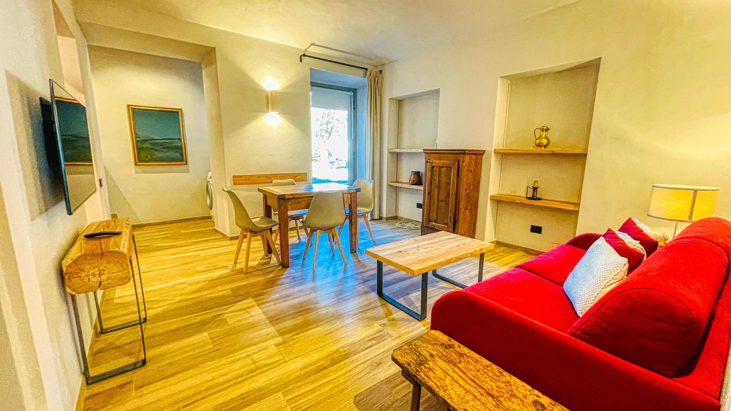 Al primo piano senza ascensore, l'abitazione è composta dal soggiorno luminoso con zona pranzo, angolo cottura fornito di microonde e lavatrice, divano letto. A disposizione degli ospiti la Smart Tv (con possibilità di collegamento alle piattaforme streaming mediante account personali degli ospiti).