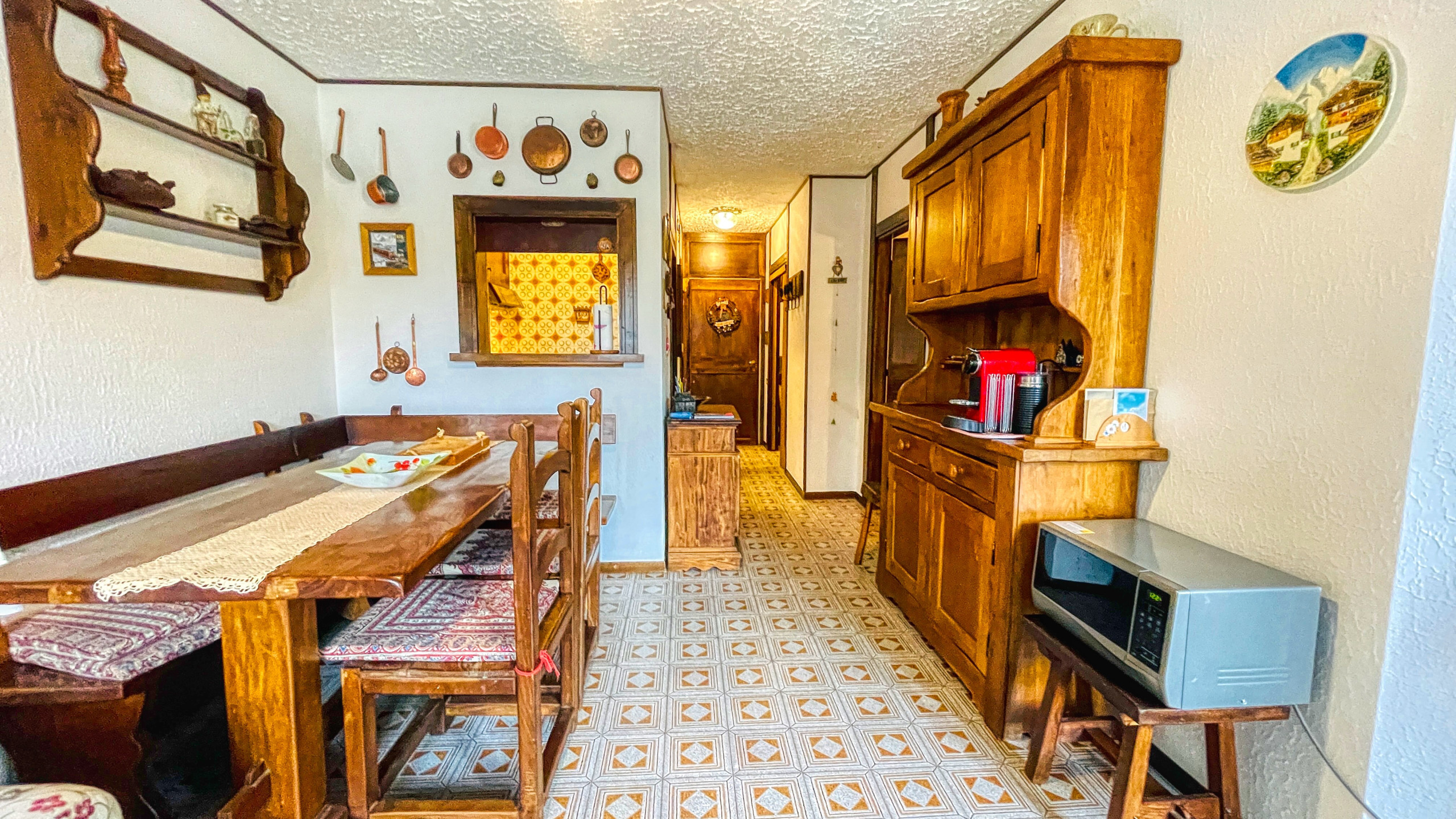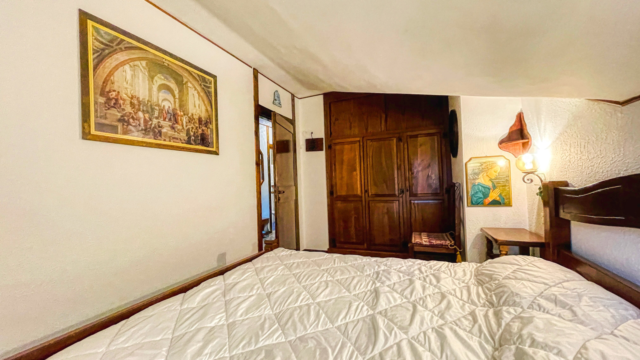L'appartamento all'ultimo piano con ascensore è composto dal soggiorno con accesso al balcone con esposizione e vista. Cucinino attrezzato con forno a microonde, bollitore, macchina del caffè. Il disimpegno porta alla camera matrimoniale, alla cameretta con letto a castello e al bagno.