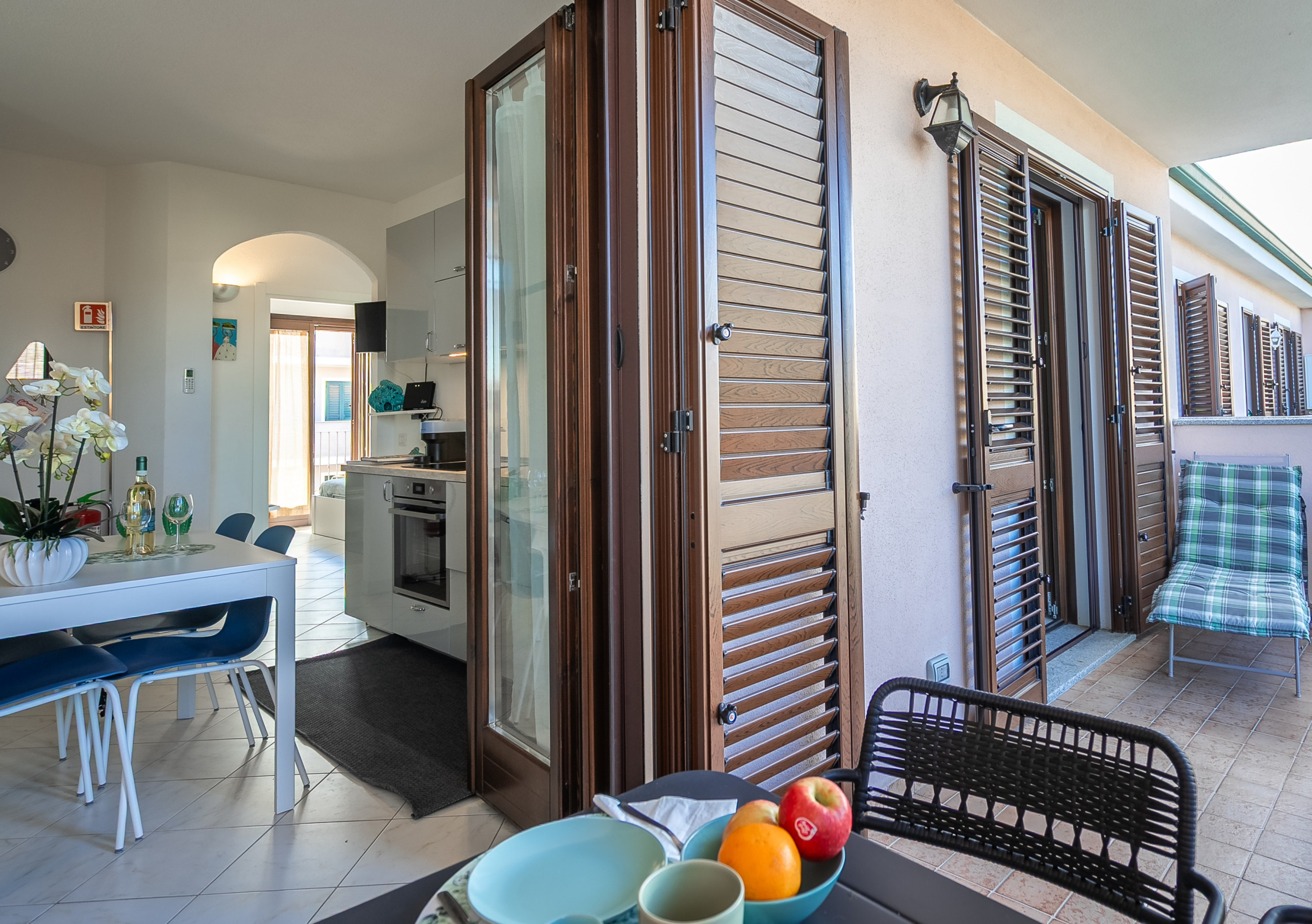 Cucina a vista con soggiorno e comodo divano letto ad una piazza e mezza. Piano di cottura a d induzione, frigorifero con freezer , lavastoviglie. Una camera matrimoniale ed una con due letti singoli, entrambe con affaccio su ampie terrazze .
