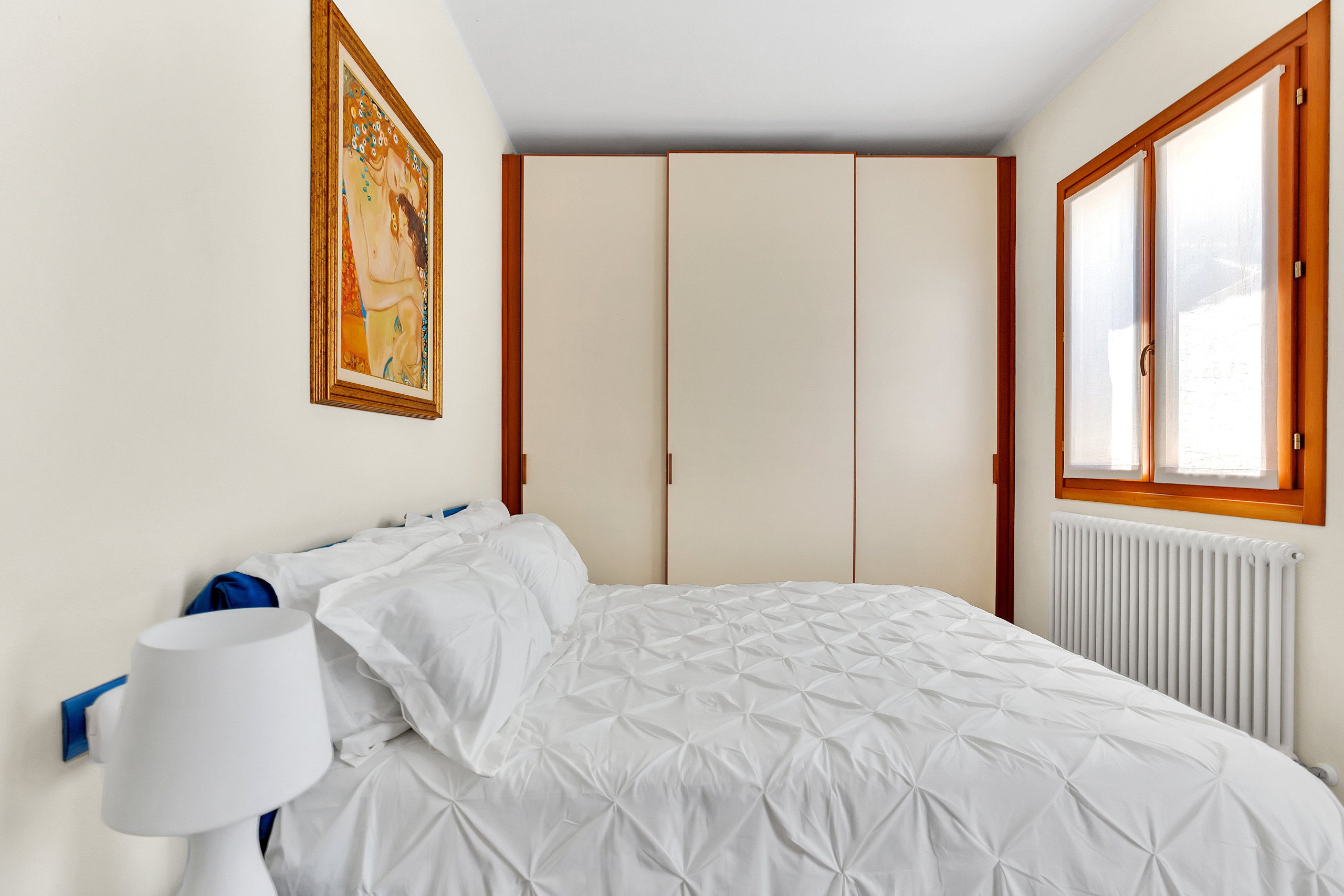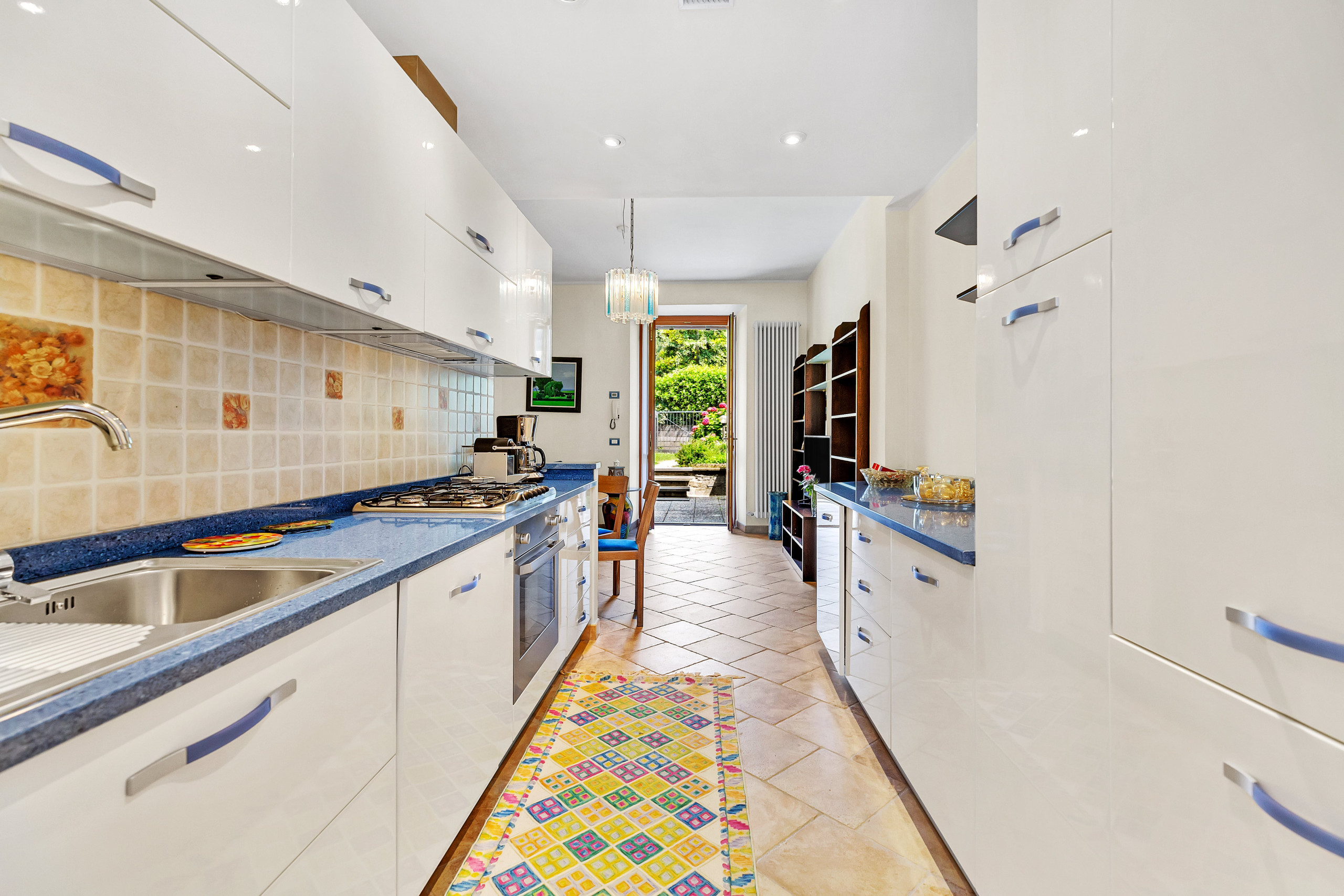 It consists of a living room with sofa bed and a fully equipped open kitchen with dishwasher, dining area with table for four. The bedroom is double and bright, with wardrobe and faces the back of the private garden, with a side view of the lake.