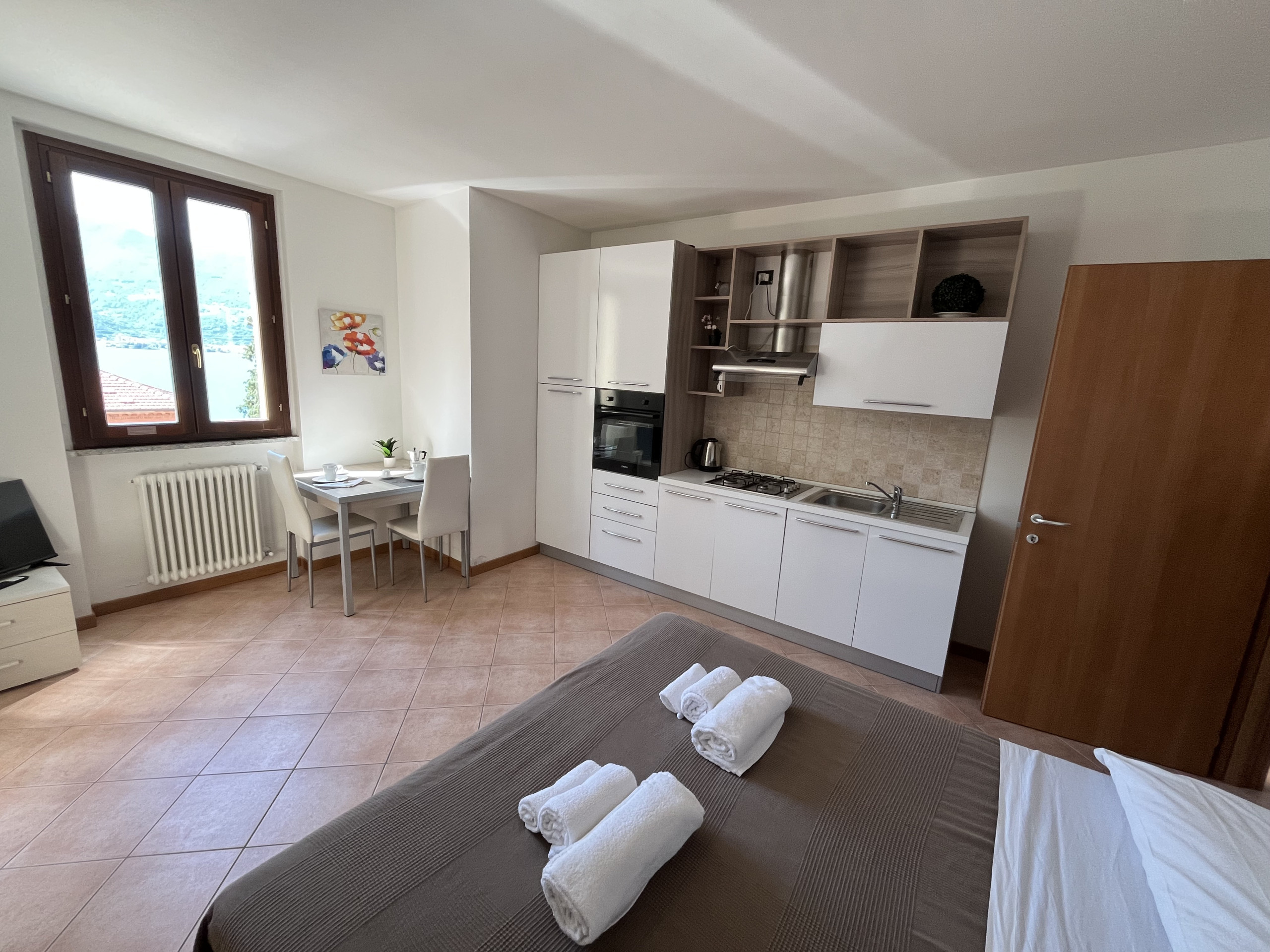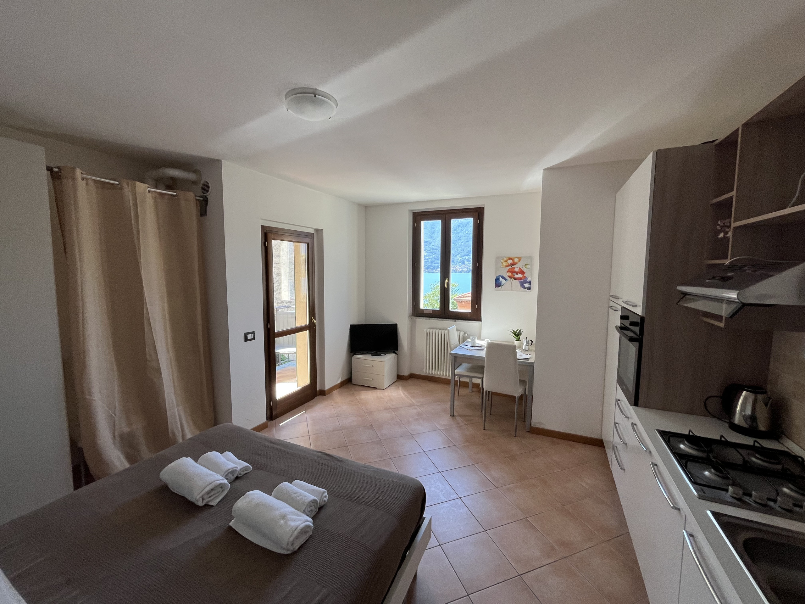 Immersed in a unique natural context, the Agone studio apartment is the perfect choice for those seeking relaxation, comfort, and postcard-like views. From the small balcony, you can enjoy a spectacular view of the lake, framed by the majestic surrounding mountains.