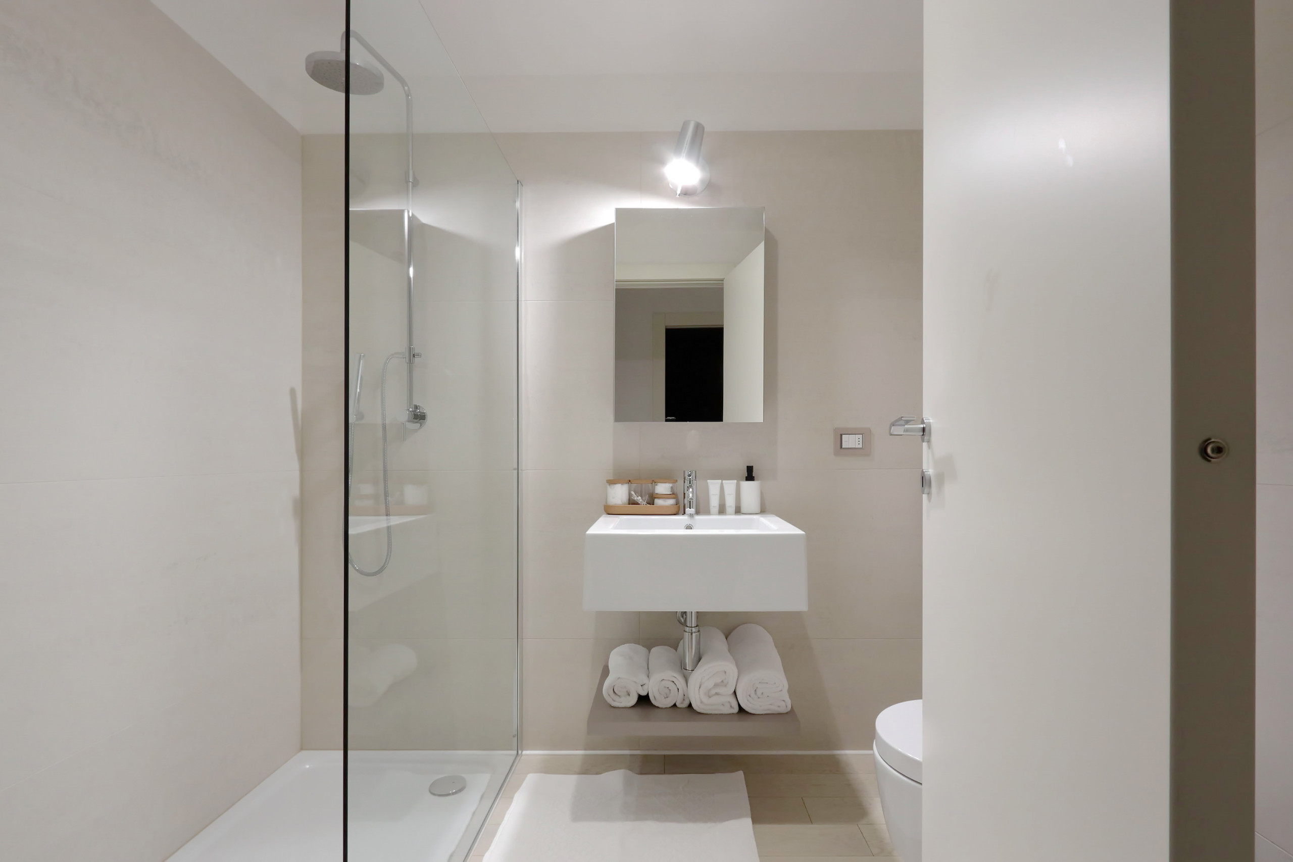 In a refined context enveloped by natural light, this open-space apartment represents the perfect harmony between contemporary comfort and Mediterranean charm. The two bedrooms, carefully curated in every detail, offer intimate and welcoming environments, while the bathroom, with its sober and elegant style, provides a daily experience of well-being and relaxation.