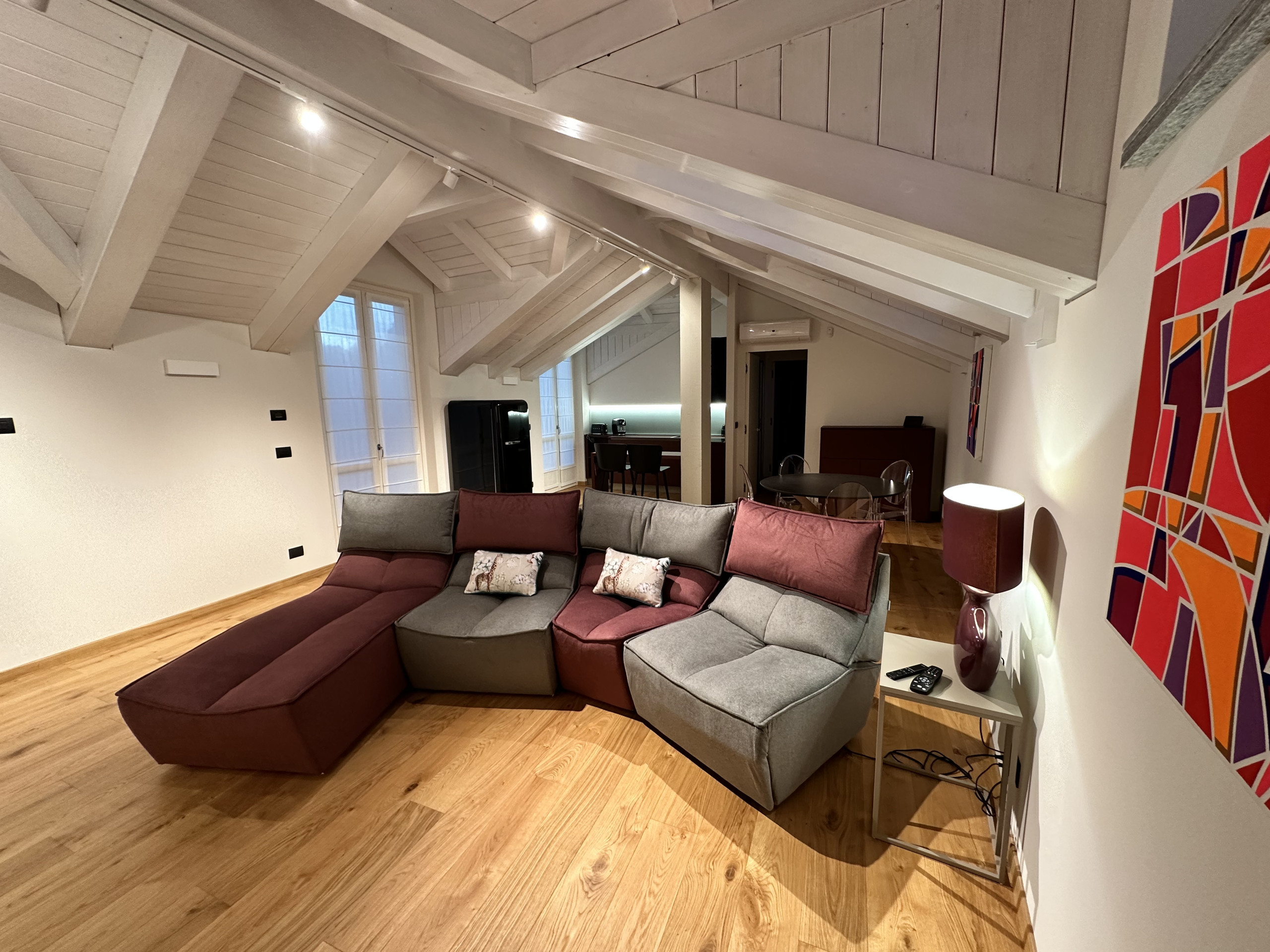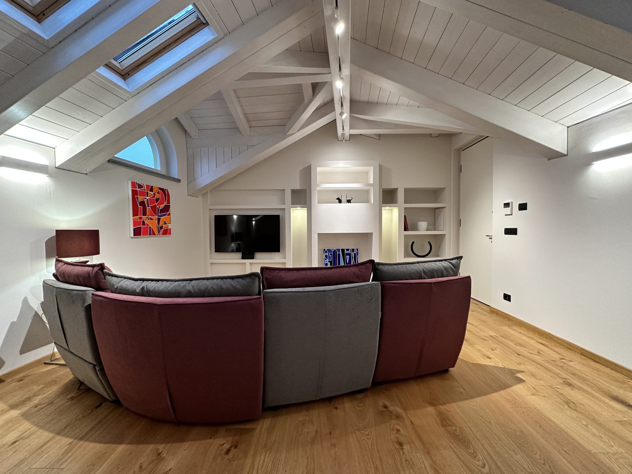 Features: living area with equipped kitchenette with double sofa bed (induction hob, combined electric oven and microwave, dishwasher, refrigerator, Lavazza capsule coffee machine, kettle, crockery, plates, glasses, and cutlery); balcony; satellite TV (Sky); double bedroom; private bathroom with flush-to-floor shower; storage room with washer-dryer; WiFi; Alexa Smart Properties; safe; centralised underfloor heating; air conditioning with heat pump.