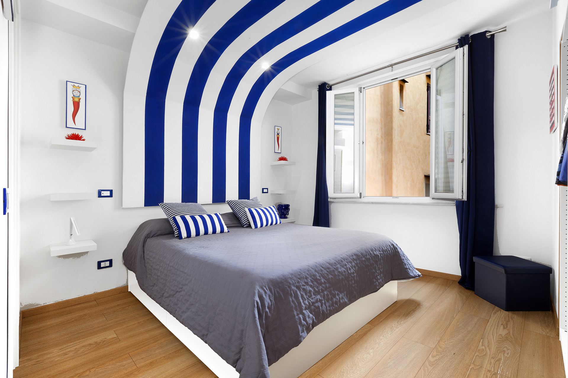 From the entrance, you will enter a spacious, minimalist living room, which contains a double sofa bed, TV, extendable dining table with chairs for 6 people, a large wardrobe, air conditioning and heating. A French window leads to a small balcony overlooking one of the many typical narrow streets found in the centre of Sorrento.