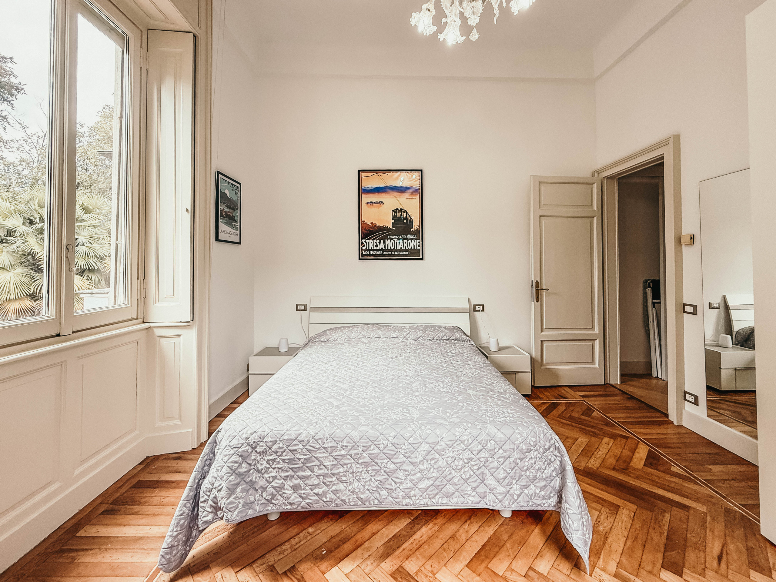 The residence consists of a main suite with period frescoes on the ceiling and Venetian Murano glass chandelier, king size bed, desk with work set and balcony overlooking the lake and park; another double bedroom with queen size bed; a third bedroom with a single bed overlooking the park; all with historic walnut and oak parquet and recently renovated with spacious wardrobes and USB power sockets next to the beds; bathroom with window, double sinks, shower, shower mat, hairdryer; large kitchen with dining table inside and two lovely tables with ceramic chairs for breakfast on the terrace, large fridge and freezer, traditional oven and microwave, dishwasher, coffee machine, milk warmer, kettle, toaster, citrus juicer, glasses wine and champagne, cutlery, plates and glasses; enchanting bright living room with triple exposure, period frescoes on the ceiling and Venetian Murano glass chandeliers connected to an imposing terrace overlooking Lake Maggiore with dining table, umbrellas and sun loungers, ideal for relaxing and admiring the Borromean Islands.